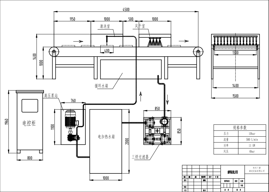 近期我們根據客戶要求及鋁模板的構造、尺寸和清洗程度,聯合技術部制作研究清洗方案,很后達成交易。其工作原理:由電機動力轉動帶動高壓泵曲軸運動,曲軸帶動連桿推動柱塞做往復式運動中,將液力端低壓水轉換成高壓水,從高壓泵出水口輸出,經過高壓膠管高壓槍等傳送,由高壓噴嘴射出,由于噴射到物體表面的沖擊力大于水泥/混凝土在鋁模板表面的附著力,從而使水泥混凝土從鋁模板表面剝離,達到清洗效果。設計制作清洗室,安裝在輸送線中間,將清洗噴嘴設置為數量的噴嘴清洗裝置放置在清洗室內,四面全覆蓋式清洗;工作過程:將需要清洗的鋁模板放置在輸送線一端,有由輸送線滾軸帶動輸送 進入清洗室內進行完整清洗,然后從清洗室另一端輸送出去,清洗完成。